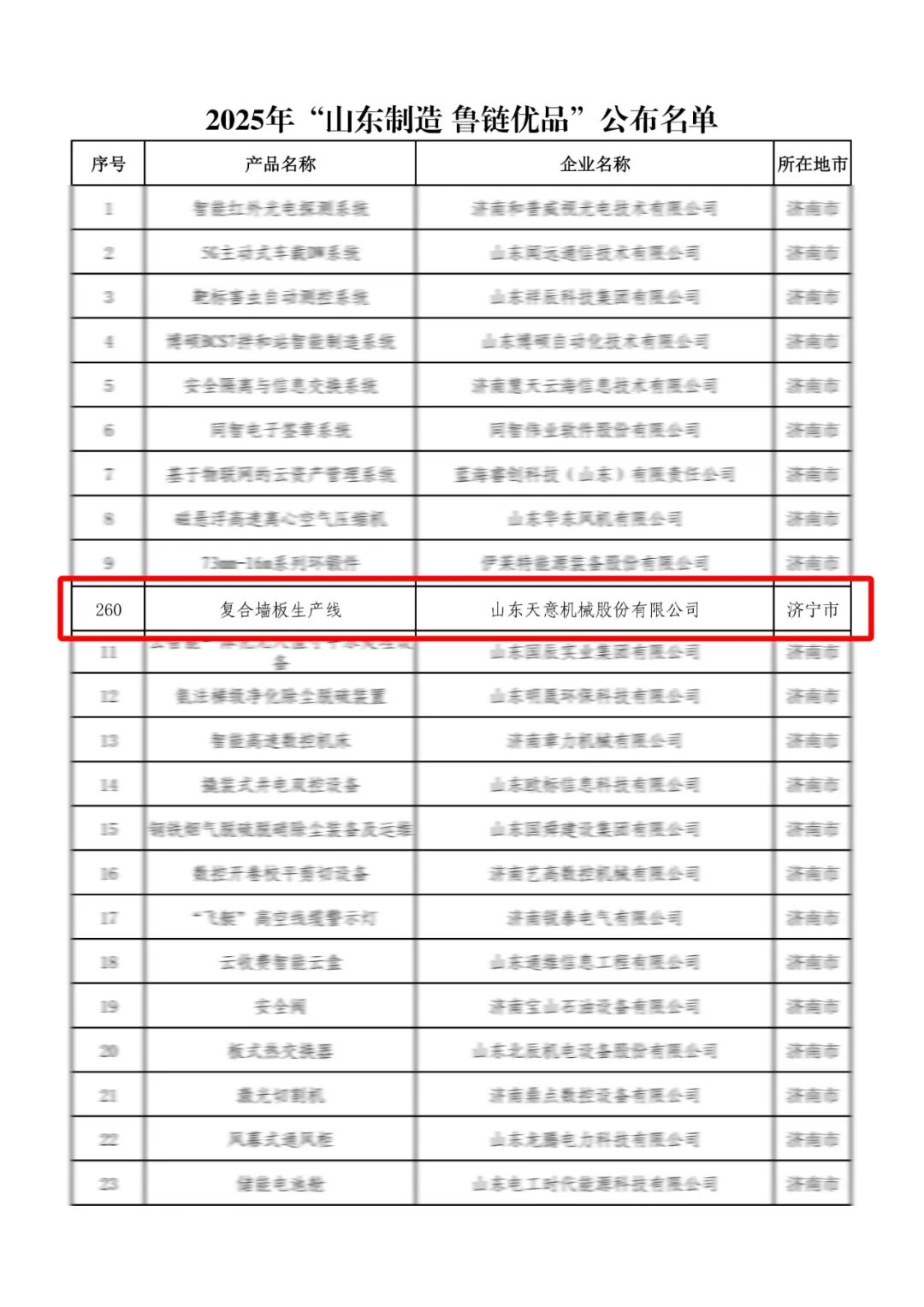 喜報|天意機械復合墻板生產(chǎn)線榮獲“山東制造·魯鏈優(yōu)品”